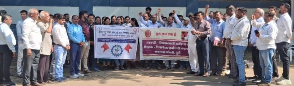 सरकारी कर्मचार्यांनी दिं ११ नोव्हेंबर रोजी संतप्त निदर्शने नोंदवली. (धुळे) जुनी पेन्शन योजना लागू करावी यासह प्रलंबित मागण्या पुर्तीसाठी सरकारी निमसरकारी कर्मचारी व शिक्षक -शिक्षकेतर कर्मचारी संघटना समन्वय समिती व राज्य सरकारी कर्मचारी मध्यवर्ती संघटना महाराष्ट्र यांच्या १८ लाख कर्मचारी शिक्षकांचा दिं ११ नोव्हेंबर रोजी राज्यव्यापी निदर्शने नोंदविण्यात आली. राज्यात बळीराजा वर अस्मानी संकट कोसळल्याे त्या अनुषंगाने शेतकऱ्यांना आधार देण्यासाठी सरकारी कर्मचार्यांचे एक दिवसाचे वेतन ” मुख्यमंत्री सहाय्यता फंडात” कर्तव्य भावनेने देण्यात आले आहे.. सुधारीत राष्ट्रीय निवृत्ती वेतन योजनेची अंमलबजावणीसाठी आवश्यक मार्गदर्शक सूचना प्रसिद्ध करण्यासाठी व जुनी पेन्शन योजना जशीच्या तशी लागु करणे..पेन्शन विक्री 15 ऐवजी 11 वर्षे करणे… पी एफ आर डी ए कायदा रद्द करणे… वय वर्ष 60 65 आणि 75 नंतर अनुक्रमे पाच दहा आणि पंधरा टक्के वाढ निवृत्तीवेतनधारकांना लागू करणे… राज्य शासकीय कर्मचाऱ्यांना रेल्वे सवलत लागू करणे… कंत्राटी कर्मचाऱ्यांना नियमित सेवेत सामावून घेणे… आणि आठवा वेतन आयोग केंद्राप्रमाणे सत्वर लागू करणे व त्या अनुषंगाने अर्थसंकल्पात तरतुद करणे, इतर प्रलंबित मागण्यांसाठी दिं ११ नोव्हेंबर रोजी समन्वय समितीच्या व राज्य सरकारी कर्मचारी मध्यवर्ती संघटनेच्या सर्व कर्मचारी व शिक्षक -शिक्षकेतर कर्मचारी मोठ्या संख्येने क्युमाईन क्लब,जेल रोड, धुळे येथे दुपारी १:०० वाजता भोजन काळात निदर्शने नोंदविण्यासाठी उपस्थित होते कर्मचाऱ्यांनी सरकार विरोधात संतप्त घोषणाबाजी करीत लक्ष वेधले श्री राजेन्द्र माळी श्री अविनाश मोरे श्री सुधीर पोतदार श्री दिनेश सैंदाणे, श्री डी एच देसले, श्री गिरीश पाटील, श्री प्रवीण राजपूत, श्री मोहन सानप, श्री भुषण पाटील श्री सुधीर खैरनार ,श्री नरेंद्र सोनार, श्री कैलास पवार, श्री प्रशांत धनगर, श्री नागनाथ वासते,श्री एल आर राव, श्री पोपट चौधरी श्री सुनील दावने श्री राजेन्द्र चौरे, श्री दिपक सोनवणे, श्री साहेबराव पाटील श्री शरद राव आदींनी या प्रसंगी मनोगत व्यक्त केले